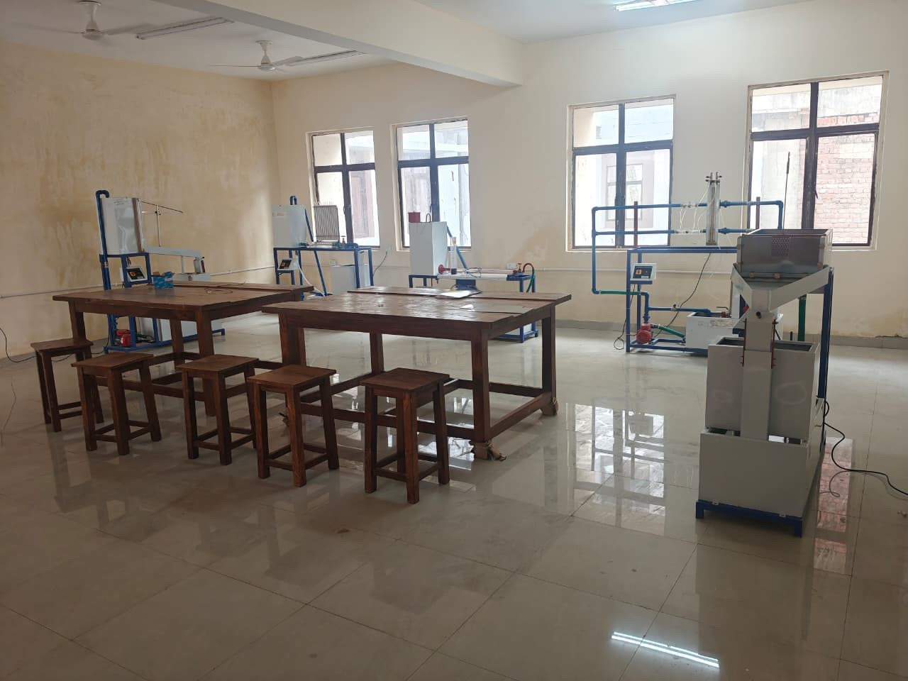 The Fluid Mechanics Lab helps students understand how fluids behave in motion and at rest. It includes experiments on measuring flow rates, pressure, viscosity, and forces exerted by fluids. Students use devices such as venturi meters, orifice meters, flow channels, and pumps to observe real-life fluid behaviour. The lab strengthens theoretical concepts by providing hands-on experience, which is essential for designing hydraulic structures, water supply systems, and other engineering applications.